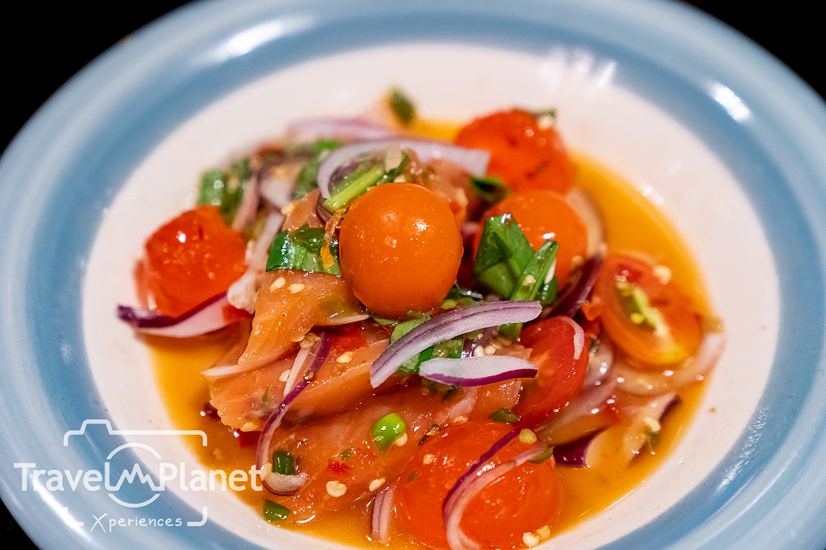นอกจากปูแล้วบริเวณนี้ยังมีอาหารอีก 2 อย่างที่เราสามารถสั่งทานได้คือ ยำแซลมอนไข่แดงเค็ม และ กั้งทอดกระเทียม ส่วนตัวเราว่ายำแซลมอนไข่แดงเค็มคือดี เพราะรู้สึกว่าได้ฟีลอาหารบ้านๆดีซึ่งปกติในโรงแรมไม่ค่อยทำเมนูแบบนี้มาให้เราทานกันเท่าไหร่