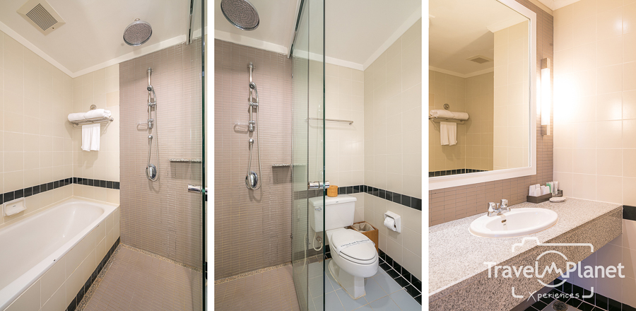 มาดูห้องนอนกันบ้าง เปิดประตูเข้าไปเจอเตียงใหญ่ๆรอให้กระโดดลงไปนอนอยู่ ฝั่งปลายเตียงก็จะมี ทีวี โต๊ะเครื่องแป้ง และโต๊ะทำงาน ส่วนห้องน้ำเท่าที่ดูน่าจะมีการปรับปรุงในการเพิ่ม Rain Shower ให้เข้ากับสมัยนิยมเข้ามาด้วย และชักโครกมีฝักบัวชำระ (อันนี้ปลื้มปริ่ม เพราะโรงแรมใหม่ๆ โดยเฉพาะโรงแรมเชนฯ ชอบทำแบบสไตล์ตะวันตกซึ่งจะไม่มีฝักบัวชำระ) เรื่องอเมนนิตี้ที่นี่ถือว่าได้มาตรฐาน แต่ขาดในส่วนของชุดแปรงสีฟันยาสีฟันไป ซึ่งผมแจ๊คพอตพอดีที่ลืมเอามาเหมือนกัน เลยลงไปซื้อจากที่ร้านสะดวกซื้อเอาครับ