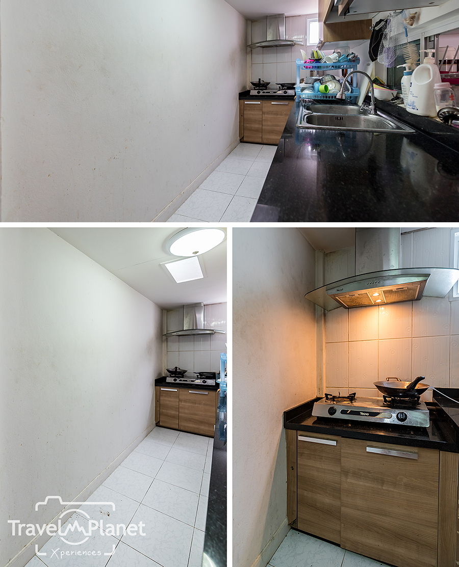 มาดูสภาพครัวเบื้องต้นของบ้านเราก่อน จะเห็นว่าตรงผนังจะมีคราบเลอะๆที่ขัดไม่ออกแล้วกระจายเต็มผนัง และตรงแถวๆเตาแก๊สสีก็จะดำๆจากเขม่าควันตอนทำกับข้าว