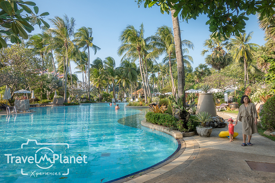 แน่นอนว่ามีสระว่ายน้ำเยอะขนาดนี้น้องโฟกัสไม่พลาดแน่นอน (คือเด็กพูดมาตลอดการเดินทางมาที่โรงแรมว่าจะไปว่ายน้ำโรงแรม 5 ดาว) อยากขนาดนี้พ่อไม่ขัดใจแน่นอนลงน้ำกันเลยจ้า เราก็เลยพากันไปเปลี่ยนชุดว่ายน้ำที่ห้อง ก่อนมาเดินเลือกสระ ว่าจะเล่นน้ำที่สระไหนดี ก็รีสอร์ทแห่งนี้ มีสระว่ายน้ำตั้ง 4 สระ ใหญ่ทุกสระเลย เราก็ไปด้อมๆ มองๆ หาสระที่คนน้อยๆ หน่อย เพราะมีเด็กไปด้วย จะได้ไม่รบกวนแขกคนอื่น ในที่สุดก็ได้มาสระตรงนี้ ที่ชอบเพราะเค้าทำเป็นทางลาดเดินลงสระ มันเหมือนเดินจากหาดทรายลาดลงทะเลดี เด็กจะได้ไม่ตกใจเวลาลงน้ำตอนแรก