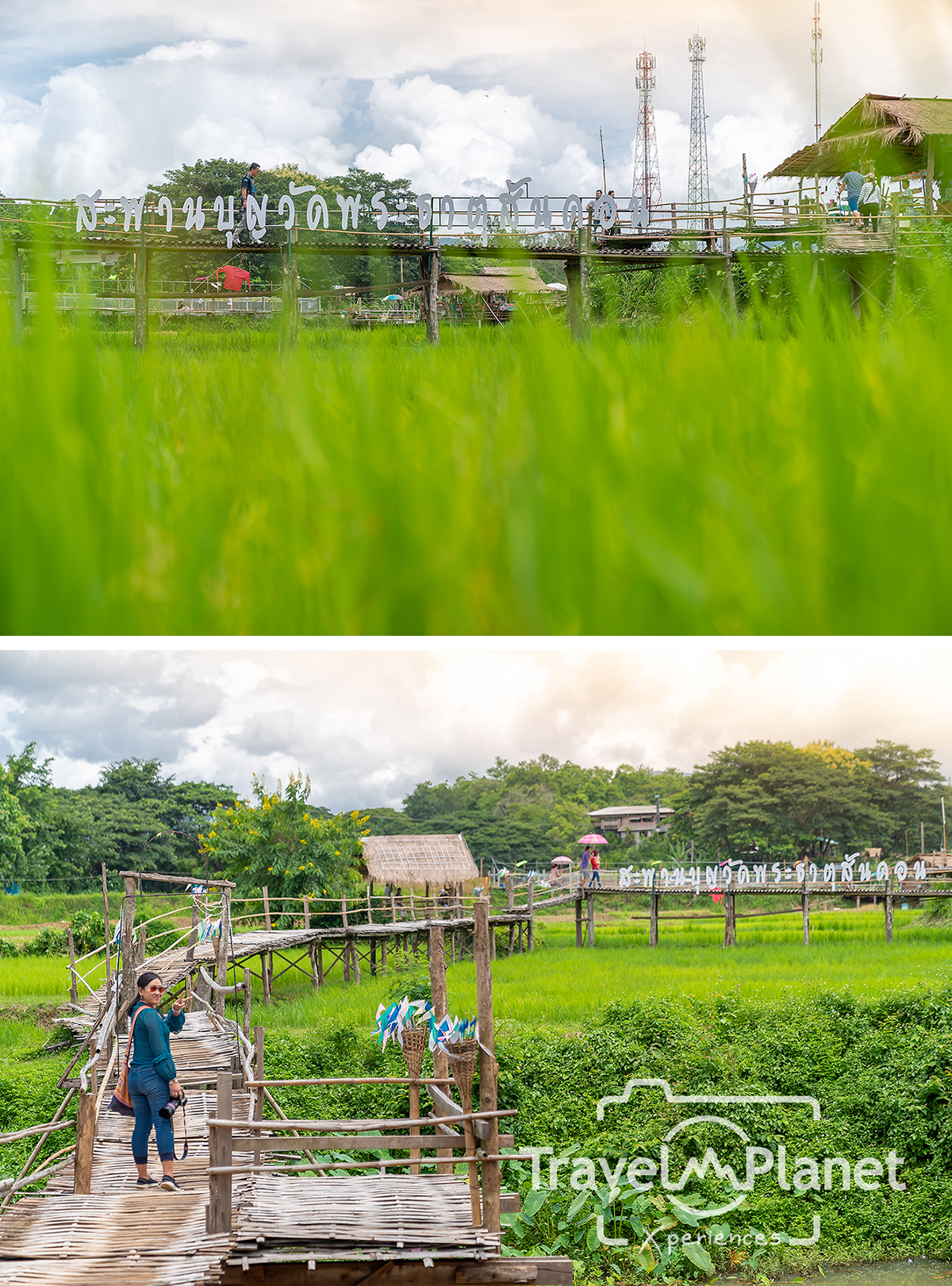 จุดเด่นของที่นี่หาใช่ตัววัด หากแต่เป็น “ขัวแตะ” หรือสะพานไม้ที่ชาวบ้าน ร่วมกันคิดและลงมือทำโดยไม่ได้ใช้งบประมาณของรัฐเลยแม้แต่บาทเดียว โดยสะพานไม้แห่งนี้ทอดยาวกว่า 360 เมตรผ่านทุ่งนาและแม่น้ำเพื่อให้สามารถเชื่อมต่อกับถนนสาย 11 ได้โดยตรง ซึ่งเป็นการอำนวยความสะดวกให้ทั้งพระและชาวบ้านในละแวกนั้นให้สามารถไปมาหาสู่กันได้ง่ายขึ้นนั่นเอง